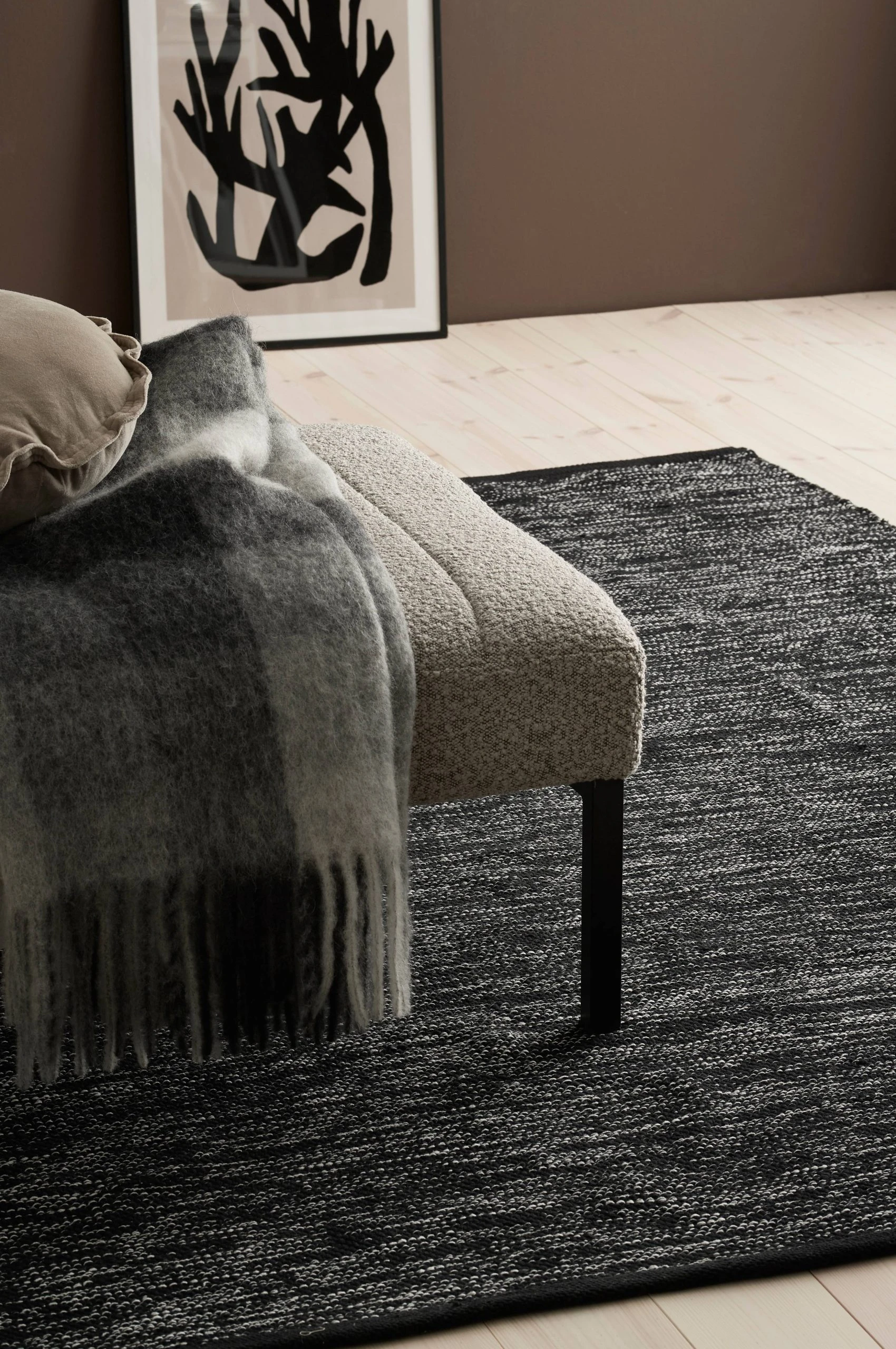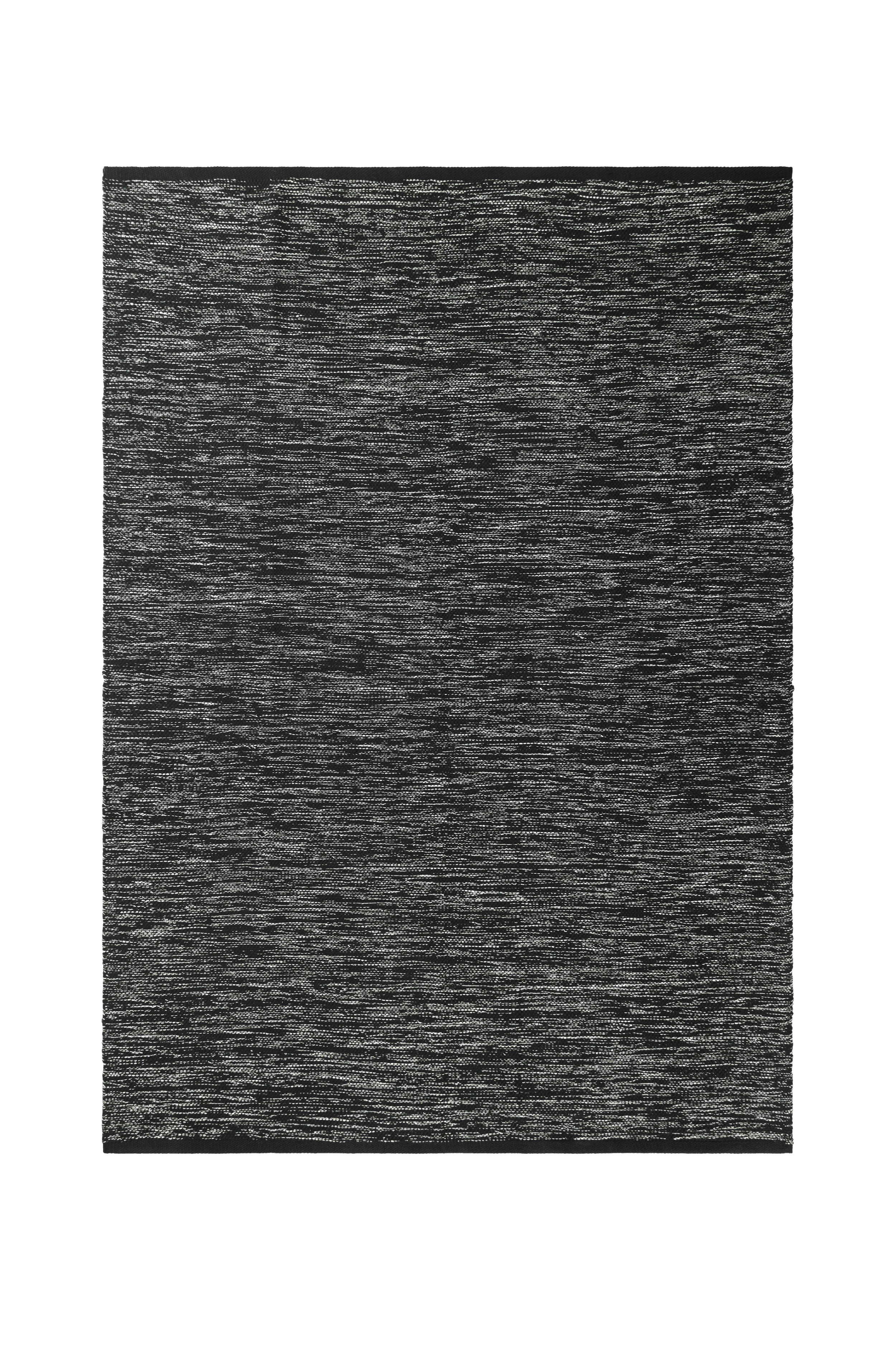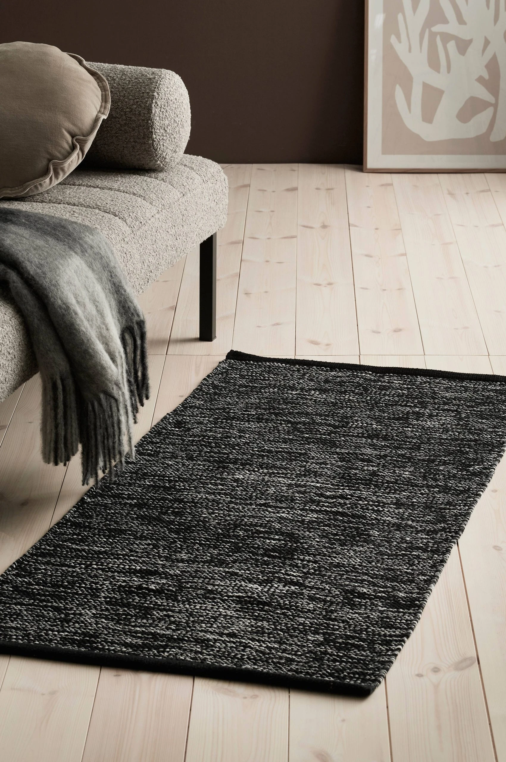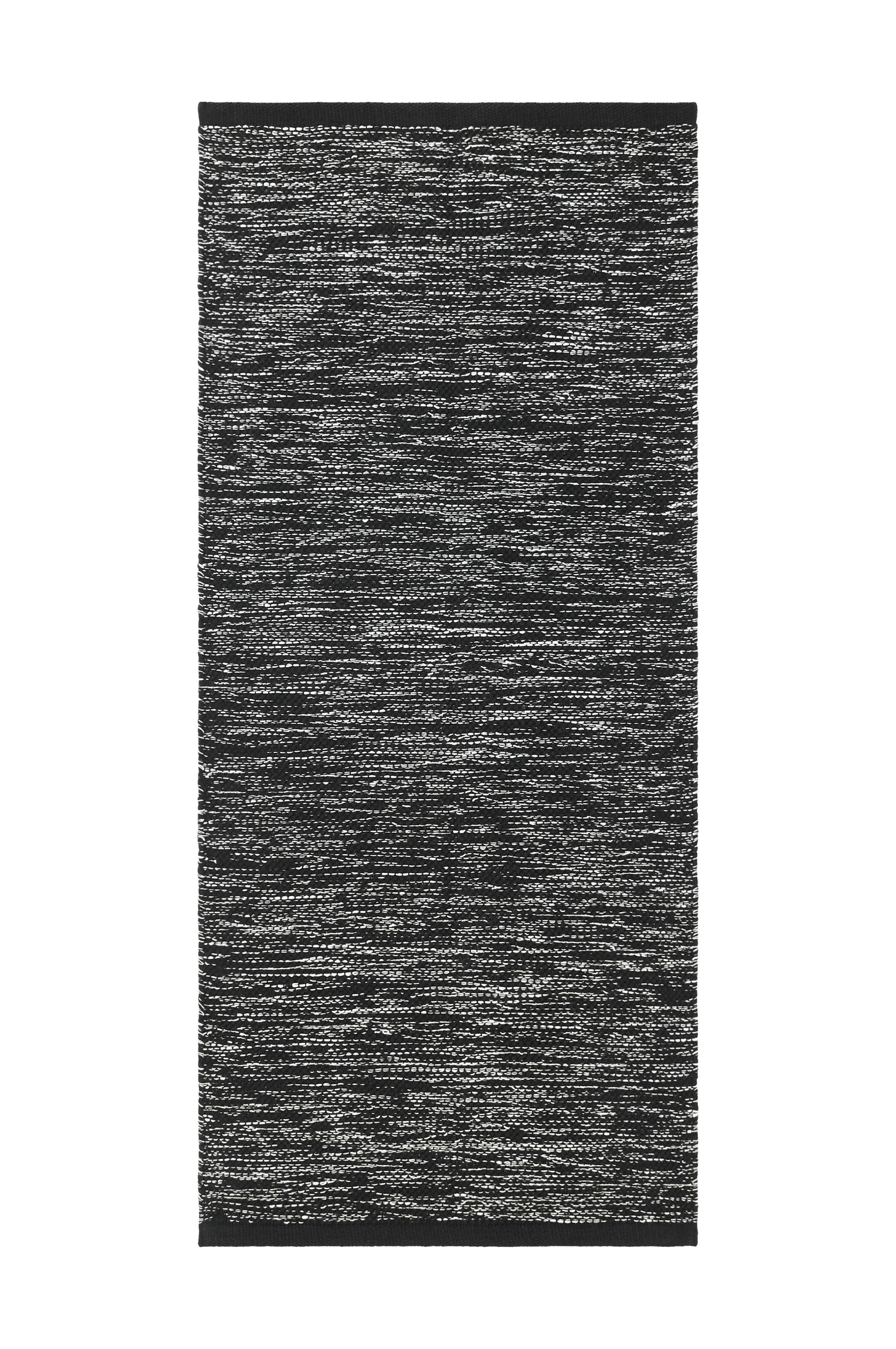 SlÀtvÀvd bomullsmatta i melangefÀrgat garn med enfÀrgade bÄrder pÄ kortsidorna. Höjd 0,5 cm.