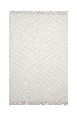 Bomullsmatta Viterbo har en slÀtvÀvd framsida med ett dekorativt, tuftat diagonalmönster. Fransar med knutar.