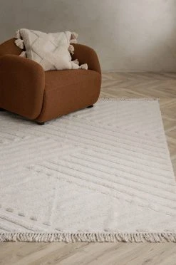 Bomullsmatta Viterbo har en slÀtvÀvd framsida med ett dekorativt, tuftat diagonalmönster. Fransar med knutar.