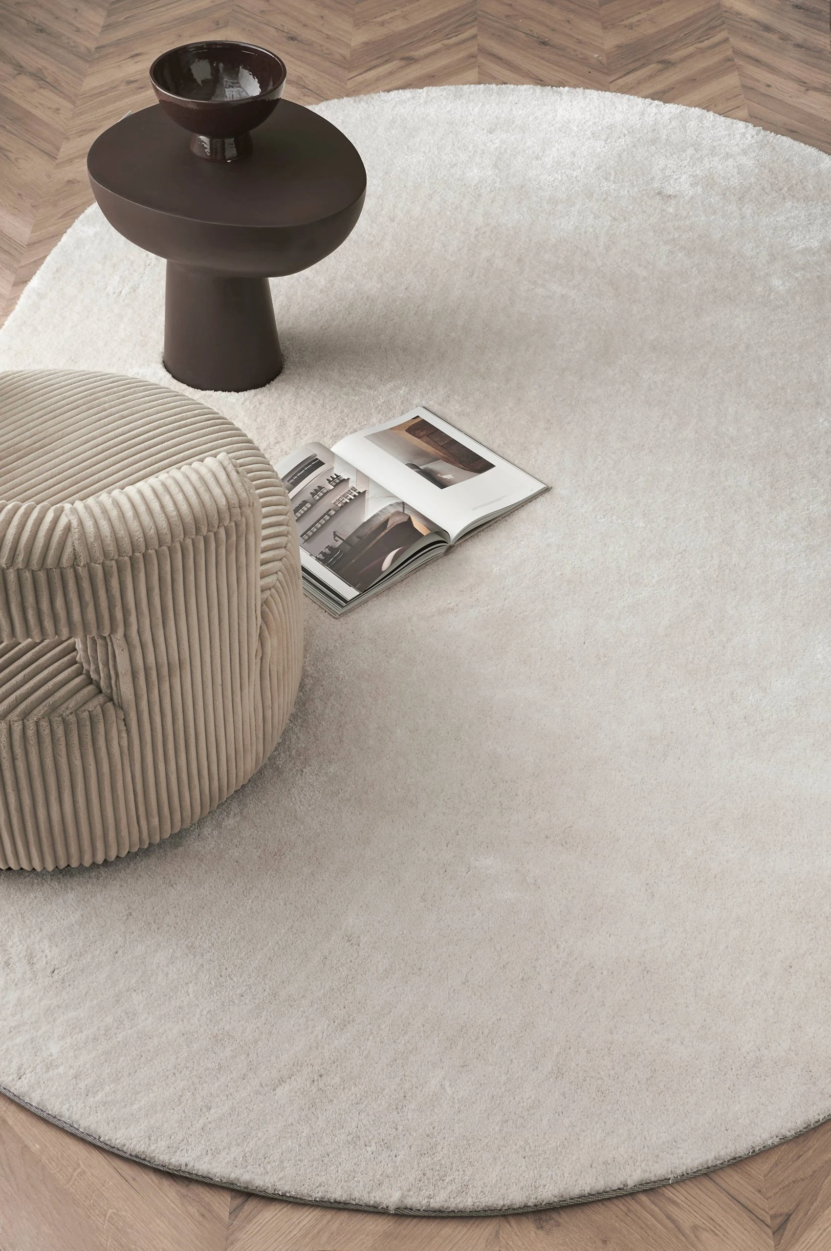 Oval, tuftad matta i mjuk kvalitet med skimrande lyster. Tjocklek 2 cm.