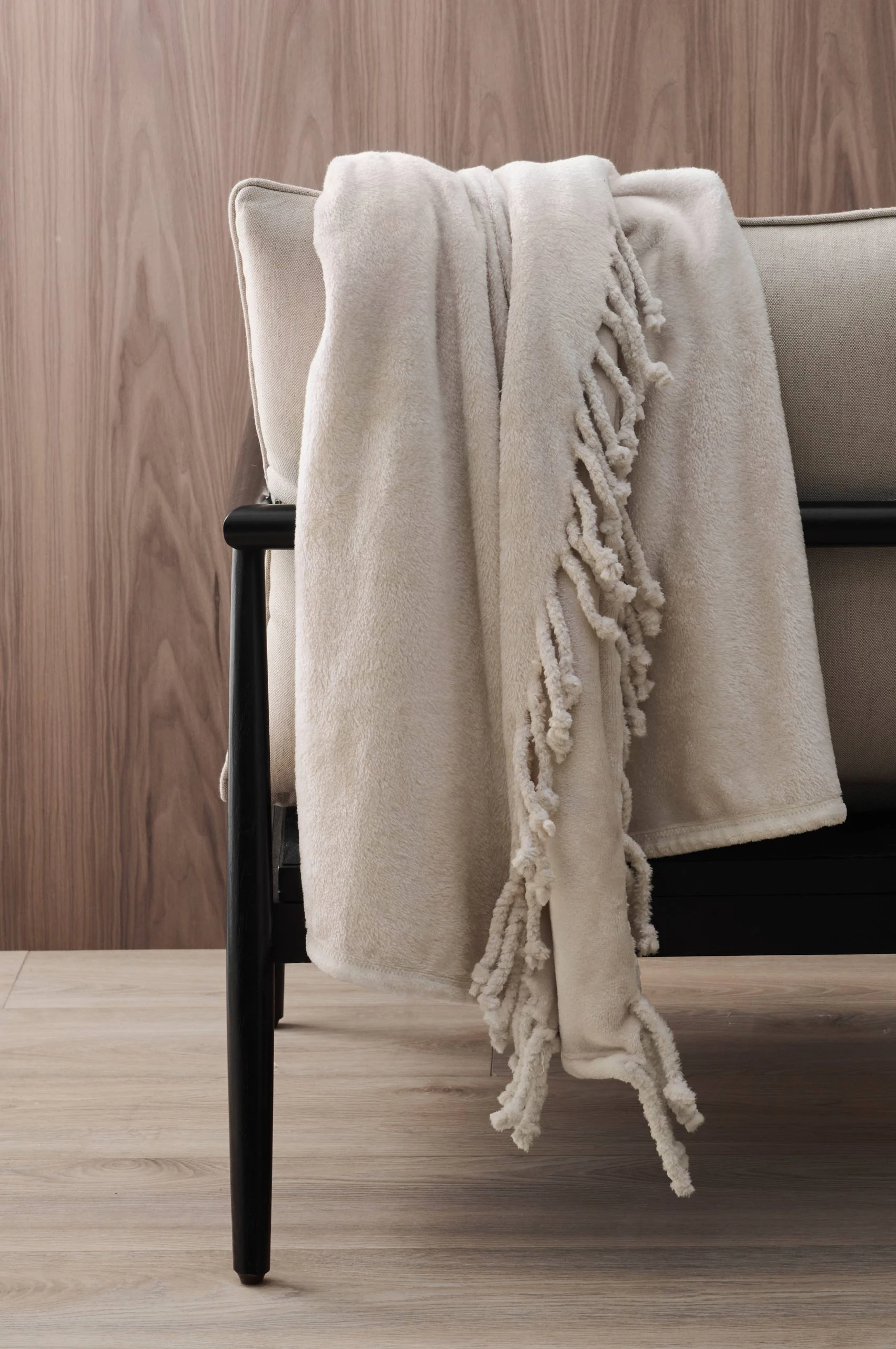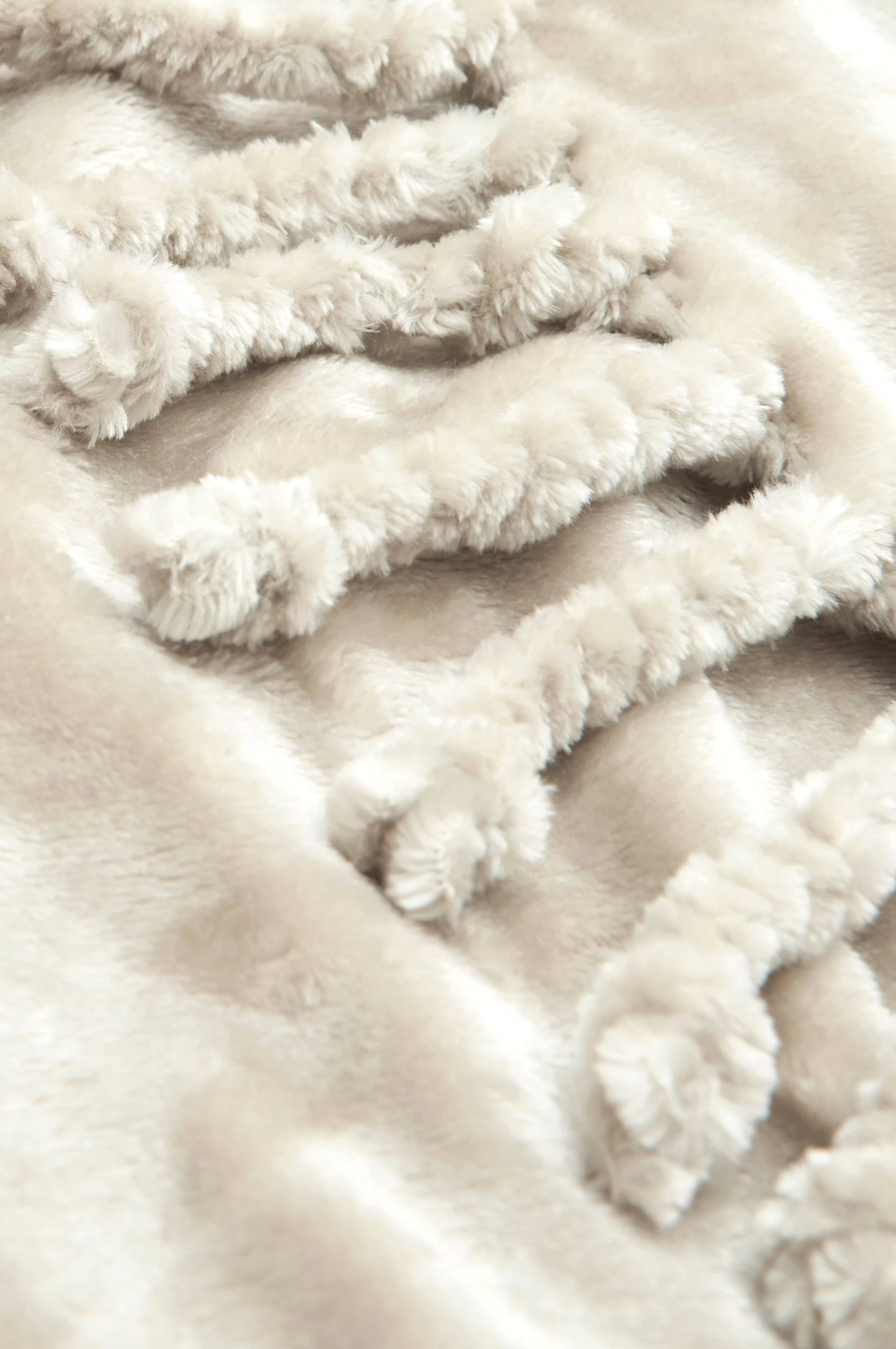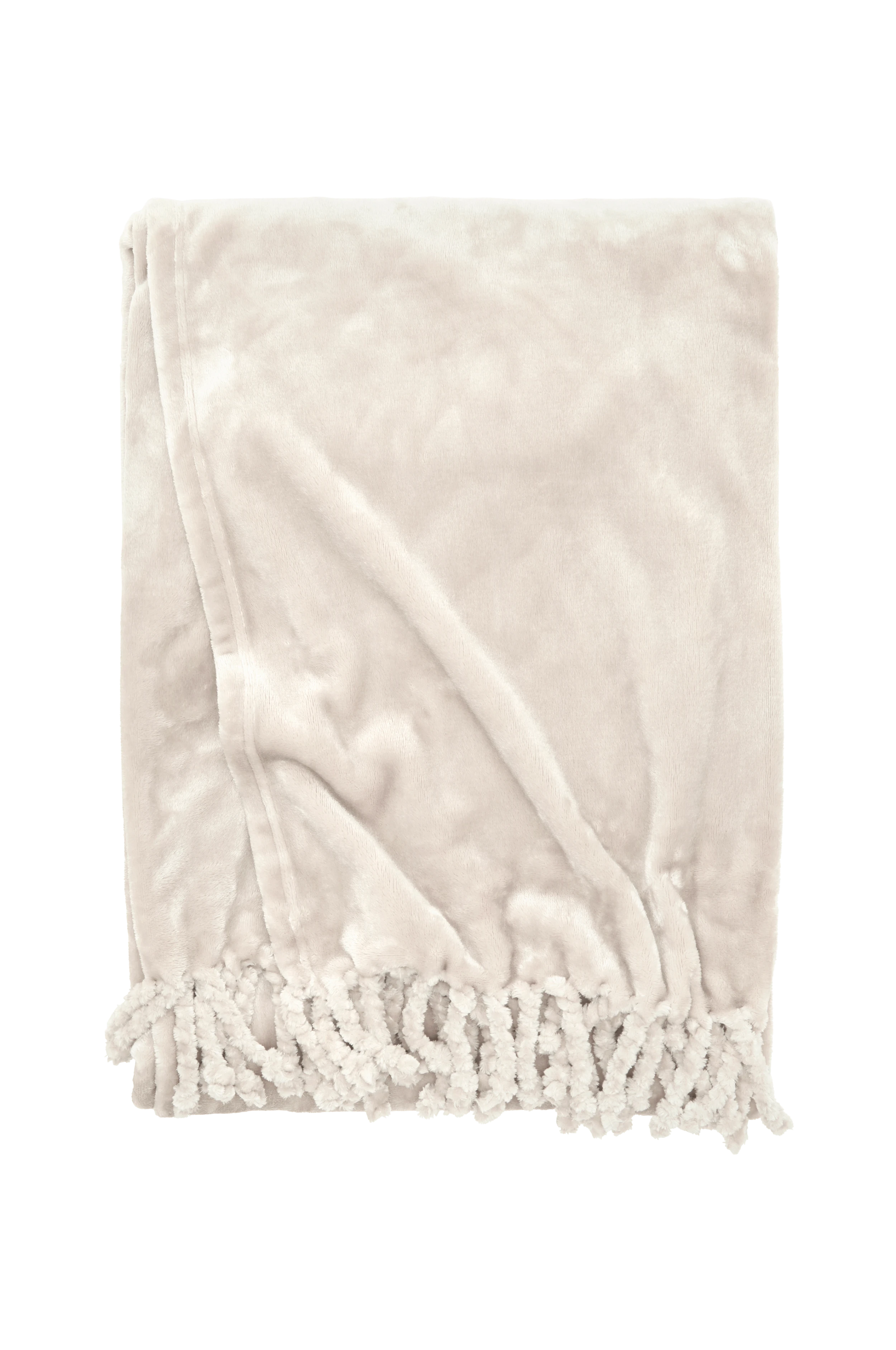 Pläd i mjuk och skön fleece med lätt lyster och handgjorda fransar. Stl 130×170 cm + 8 cm fransar på varje kortsida.