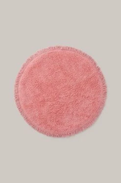 Rund, tuftad badrumsmatta med fransar runt om. Diameter 70 cm.