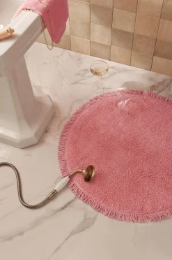 Rund, tuftad badrumsmatta med fransar runt om. Diameter 70 cm.
